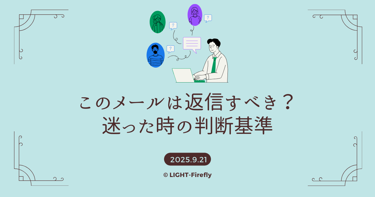 メールは相手に情報を伝える上で有効なツールであることは間違いないですが、形式的で内容の無いメールは相手のメールボックスを圧迫し、送信者側と受信者側双方の時間を奪います。しかしながらメールへ返信しないと「メール届いてますか?」などとあとから相手に返信を催促されたりする恐れも。だからこそ、メールの返信に対しては自分の中で一定の基準を持つことが大切です。